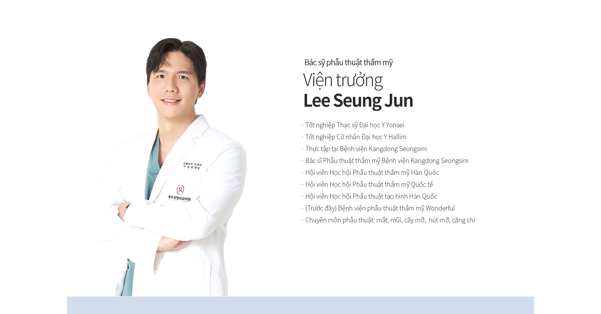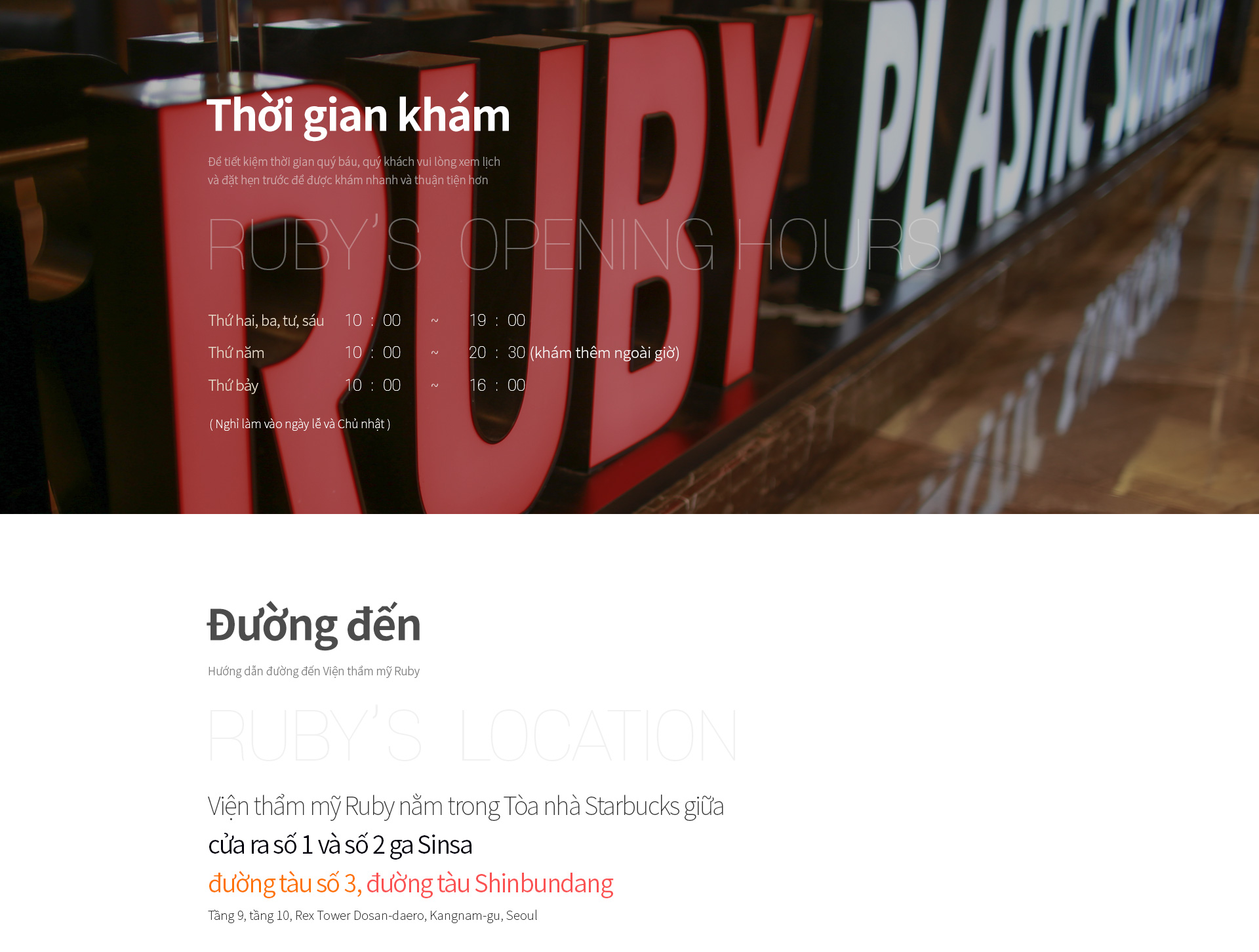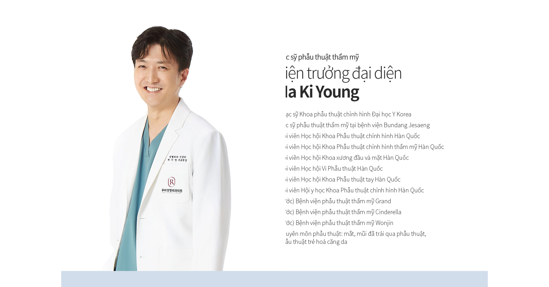 RUBY'S Competitivity Viện thẩm mỹ Ruby tạo ra kết quả khác biệt bằng sự tự tin và năng lực khác biệt trong ngành thẩm mỹ! Điểm cạnh tranh chủ yếu của Ruby Viện thẩm mỹ Ruby luôn đặt sự an toàn của khách hàng lên ưu tiên hàng đầu Chúng tôi coi trọng việc thấu hiểu để đáp ứng nhu cầu của quý khách Chúng tôi tìm kiếm vẻ đẹp phù hợp riêng với từng cá nhân Cung cấp dịch vụ y tế uy tín, đáng tin cậy Different Skills Different Resuls cùng với Ruby Bạn sẽ trở nên đặc biệt hơn bao giờ hết Viện thẩm mỹ Ruby với đội ngũ y bác sỹ giàu kinh nghiệm sau khi tư vấn cho khách hàng một cách thẳng thắn và trung thực, sẽ tiến hành phân tích chính xác để đưa ra kế hoạch tìm kiếm vẻ đẹp phù hợp và chi tiết nhất cho bạn Viện thẩm mỹ Ruby không chỉ mang đến vẻ đẹp mà còn nâng cao giá trị cuộc sống Điều bạn cần ngay lúc này đây, chính là Viện thẩm mỹ Ruby! PLASTIC SURGERY RUBY Refresh Bạn sẽ cảm nhận được niềm vui của cuộc sống mới Unique Beauty Chúng tôi sẽ giúp bạn tìm kiếm Nâng chuẩn mực của cái đẹp vẻ đẹp của riêng mình lên một tầm cao mới Young Bạn sẽ trẻ dần ra từ bên ngoài đến tận sâu bên trong da RUBY PLASTIC SURGERY Specialist Medical Team 01 Đội ngũ y bác sỹ từng lĩnh vực dịch vụ y tế phù hợp với từng cá nhân Đội ngũ y bác sỹ giỏi về phẫu thuật thẩm mỹ, petit & da liễu, gây mê sẽ làm hết sức mình để khiến bạn hài lòng #hệ thống y tế phù hợp với từng đối tượng một cách có hệ thống #dịch vụ y tế lấy sự hài lòng của thượng để làm trọng tâm 02 Phẫu thuật thẩm mỹ từng lĩnh vực xây dựng hệ thống y tế chuyên môn đội ngũ nhân sự y tế giàu kinh nghiệm Đảm nhận từ khâu tư vấn đến phẫu thuật và chăm sóc sau phẫu thuật #đội ngũ chuyên trách theo từng lĩnh vực thẩm mỹ #Nói KHÔNG với mượn tên bác sỹ hay tráo đổi bác sỹ phẫu thuật 03 Tư vấn thẳng thắn và trung thực dựa trên nền tảng uy tín với khách hàng Tư vấn kỹ lưỡng và phân tích tỉ mỉ những vấn đề hiện tại Để đưa ra giải pháp phẫu thuật thật sự cần thiết cho khách, tránh dư thừa #Lập kế hoạch phù hợp với từng cá nhân #Kết quả tốt, mức độ hài lòng cao ОЦ Chịu trách nhiệm về kết quả phẫu thuật! Thi hành chế độ bảo hành phẫu thuật 1 năm Chúng tôi luôn lấy mục tiêu đạt kết quả tốt nhất nhưng đôi khi có trường hợp cần tái phẫu thuật, có thể thảo luận với đội ngũ y bác sỹ tiến hành tái phẫu thuật miễn phí trong vòng 1năm. Chúng tôi không chịu trách nhiệm với những vấn đề do lỗi từ phía khách hàng. #phẫu thuật mắt hai mí miễn phí trong vòng 1 năm #Ngoài ra, những phẫu thuật khác cần tư vấn 05 Xây dựng hệ thống an toàn tuyệt đối nhằm cung cấp dịch vụ phẫu thuật an toàn Để phòng bị khi có tình huống khẩn cấp xảy ra Viện thẩm mỹ Ruby đã chuẩn bị một hệ thống trang thiết bị an toàn #máy kích nhịp tim #hệ thống tự phát điện (UPS) #trang bị cứu trợ khẩn cấp #tập huấn ứng phó tình huống khẩn cấp Hệ thống gây mê an toàn với đội ngũ chuyên gia Khoa gây mê Chuyên gia Khoa gây mê sẽ kiểm tra trạng thái gây mê của bệnh nhân đồng thời gian thực để đảm bảo ca phẫu thuật an toàn. #Giám sát đồng thời gian gây mê #ghi chép gây mê bệnh nhân theo đơn vị phút 08 Hệ thống quản lý hậu phẫu, càng tuyệt đối hơn sau phẫu thuật Tiến hành chăm sóc hậu phẫu giúp hồi phục nhanh sau phẫu thuật Giúp giảm thiểu những bất tiện phát sinh do phẫu thuật. #Chăm sóc lazer & sóng cao tần #Chăm sóc sẹo & Tiêm sẹo RUBY'S Competitivity Viện thẩm mỹ Ruby tạo ra kết quả khác biệt biệt trong ngành thẩm mỹ! bằng sự tự tin và năng lực khác 07 Quản lý ô nhiễm phòng phẫu thuật Lắp đặt CCTV Để duy trì phòng phẫu thuật luôn sạch sẽ, CCTV được lắp đặt trong tất cả các phòng phẫu thuật. #hệ thống thanh lọc không khí trong phòng phẫu thuật #ghi hình toàn bộ quá trình phẫu thuật